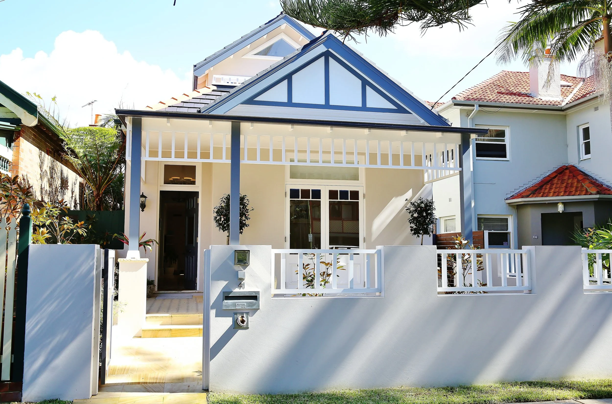 A carefully considered modern renovation to a period cottage on the flats of Manly & only walking distance to the beach. The new first floor bedrooms are set back & tucked into the new terracotta tile slate roof which has expressed rafters “v groove” soffits & ceilings. The new open plan kitchen & dining area extends out to the covered outdoor alfresco living & dining spaces and onward to the rear garden.